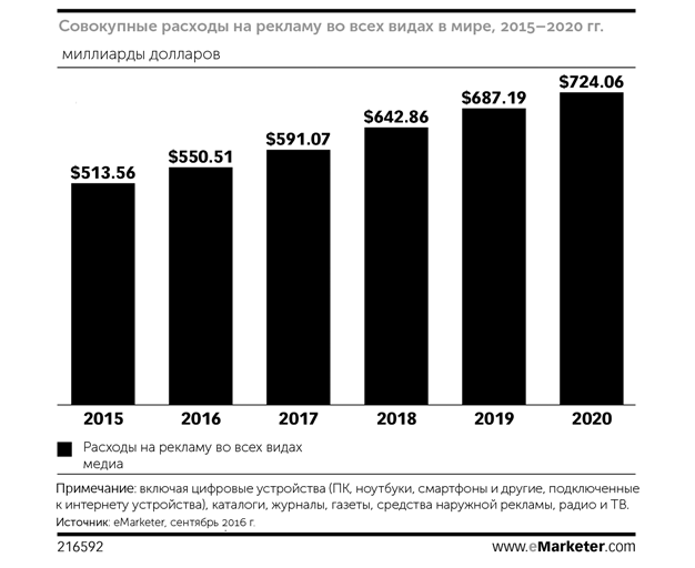 В 2016 г. совокупные расходы на рекламу по всему миру составили рекордные $605 млрд. Впервые бюджет на рекламу, распространяемую через цифровые устройства, превысил бюджет на телевизионную рекламу, причем доля рекламы на Facebook и YouTube демонстрировала стабильный рост7. Прогнозируется, что рекламные расходы продолжат расти в ближайшие годы, хотя и более медленными темпами, по мере того как медиакомпании будут искать все новые способы навязать маркетинговые послания потребителям, тем самым лишая их возможности получить максимальное удовольствие8.
