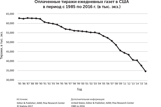 22 января 1996 г. газета The New York Times начала выходить онлайн, предоставив непосредственный доступ к своим новостям и публикациям читателям по всему миру. В период с 1990 по 2015 г., когда читатели начали активно переключаться на интернет, тиражи американских газет упали на 37%, а 2005 г. стал худшим для газетчиков, когда спрос на бумажные газеты начал стремительно падать18.