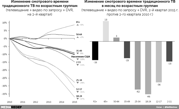 Телевизионная реклама повторяет печальную участь газетной рекламы, так как уменьшение зрительской аудитории не могло ускользнуть от внимания маркетологов20. Сокращение рекламных расходов, с которым в 2007 г. столкнулись печатные СМИ, к 2015 г. начало ощущаться и в телевизионной сфере21.