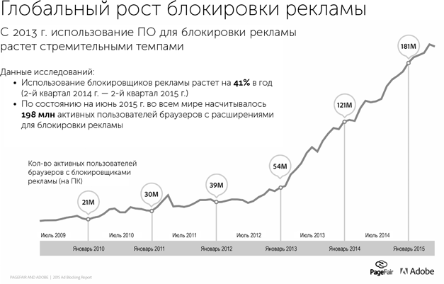 Затем появилась еще более скверная новость для маркетинга. В сентябре 2015 г. PageFair и Adobe сообщили, что на данный момент 198 млн пользователей во всем мире используют на своих ПК браузеры с блокировщиками рекламы и их число растет на 41% в год. Через месяц Apple представила обновление для операционной системы iOS, позволяющее мобильным устройствам Apple поддерживать блокировку рекламы. Предположительно в одном только 2016 г. во всем мире пользователи заблокировали рекламу общей стоимостью около $41,4 млрд. Потребители открыли новый фронт в своем восстании против рекламных вторжений и манипуляций эмоциями.