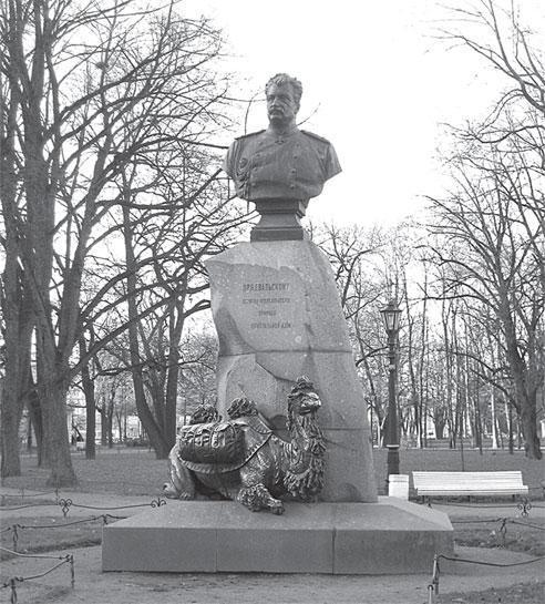 Следующий памятник, значительно превосходящий по размерам бюст Василия Андреевича, появился в противоположной части сада 20 октября 1892 г. Это – бронзовый памятник путешественнику Н. М. Пржевальскому работы скульптора Ивана Шрёдера. Создавался он, как свидетельствует надпись с тыльной стороны постамента, Императорским Географическим обществом «на приношения почитателей». Рисунок-проект создал генерал-майор Александр Александрович Бильдерлинг (1846–1912), который, несмотря на высокий воинский чин, прославился больше как художник-акварелист и как инициатор увековечивания памяти выдающихся деятелей русской истории и культуры. В Севастополе во многом благодаря его попечительству установили памятники адмиралам Нахимову, Корнилову и Тотлебену. В Петербурге в 1883 г. по его инициативе в родном ему Николаевском кавалерийском училище, начальником которого он стал после возвращения с Русско-турецкой войны 1877–1878 гг., был открыт первый в стране музей Лермонтова.