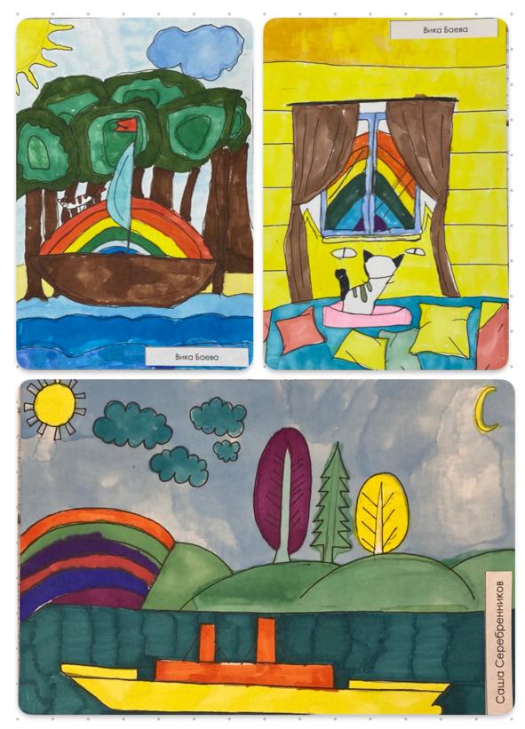 Когда полосатый кот открыл первый сундук, он увидел в нём красную рыбу. Это очень обрадовало кота. На этом он не остановился и подошёл ко второму сундуку. В нём была золотисто-жёлтая рыба. В третьем, четвёртом и пятом сундуке были аккуратно сложены зелёные, синие и фиолетовые рыбки.