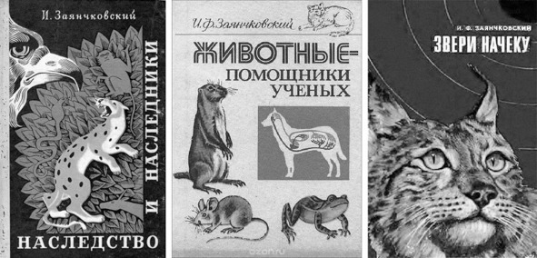 Это обложки лишь только трех научно-популярных книг И. Ф. Заянчковского. А их полтора десятка: «Занимательная зоология» (1955 г.), «Враги наших врагов» (1966), «Пастухи и артисты» (1974), «Живые барометры» (1977), «На службе у человека» (1977), «Говорящие птицы» (1981), «Памятники животным» (1983), «Твоя родословная, Акбузат» (1983), «Пернатые друзья и помощники» (1986), «Верные помощники, настоящие друзья: (О развитии коневодства)» (1988), «Рядом с человеком» (1990), «Животные, приметы и предрассудки» (1991).