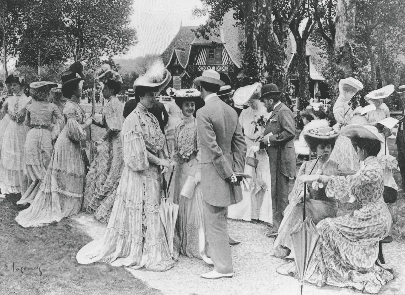 2 Бомонд в летних нарядах на морском курорте Довиль во Франции, 1903 год. Светлые, богато отделанные платья с пышными юбками и лифами с высоким воротом были типичны для высокой моды того периода. Каждый ансамбль дополняли дорогие аксессуары: шляпки, украшенные перьями или искусственными цветами, зонтики на длинных ручках, крошечные сумочки и лайковые перчатки. Элегантный мужчина в безукоризненно сшитом сюртуке, туфлях с миндалевидными носками и соломенной шляпе — граф Матье де Ноай.
