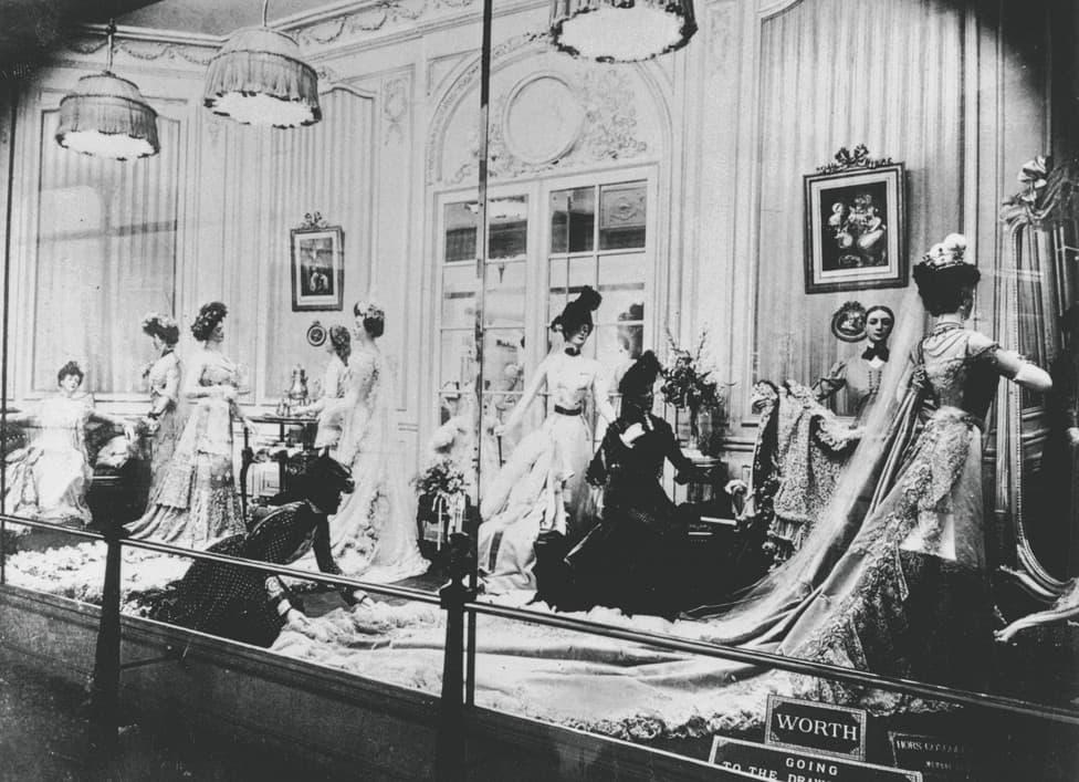 3 Тщательно продуманная экспозиция от дома Уорта под названием В гостиной на Всемирной выставке, проходившей в Париже в 1900 году. Реалистичные манекены (с аккуратно вылепленными из воска лицами) были одеты в лучшие творения дизайнера, начиная от костюма горничной и заканчивая парадным платьем для придворных церемоний.