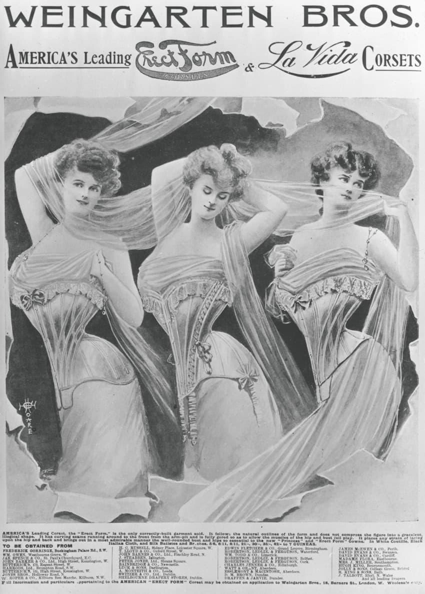 4 S-образный силуэт, характерный для начала 1900-х годов, формировался с помощью жесткого корсета. Корсеты американского производства на этом рекламном рисунке представлены в профиль, чтобы подчеркнуть ярко выраженные изгибы и полные бюсты, которые они помогали создать. Из соображений скромности вокруг трех фигур развевается тонкая драпировка.