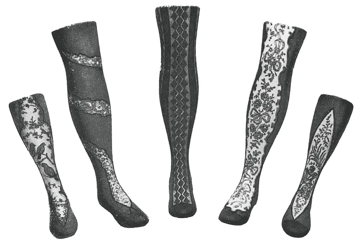 5 Чулки на вечер часто были очень нарядными. Орнамент со змеей, обвивающейся вокруг лодыжки (второй чулок слева), стал особенно популярным после того, как чулки со змеями, расшитыми пайетками, были показаны на Всемирной выставке 1900 года в Париже. Представленные здесь французские образцы датируются примерно 1903 годом.