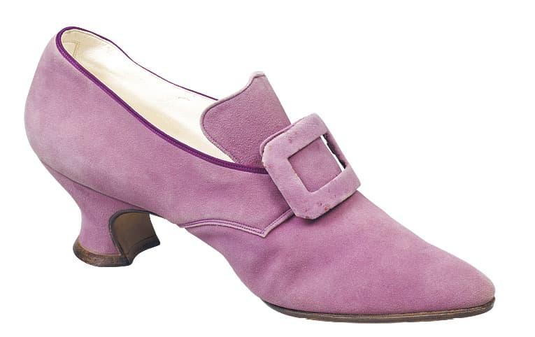 6 Женская замшевая туфля на каблуке «Людовик», изготовленная Аланом Макэфи в 1905–1910 годах. Модель с декоративной пряжкой вдохновлена стилем XIII века и известна под названием «Кромвель». Это повседневная обувь, выполненная из розовой замши, которую, вероятно, носили с платьем.