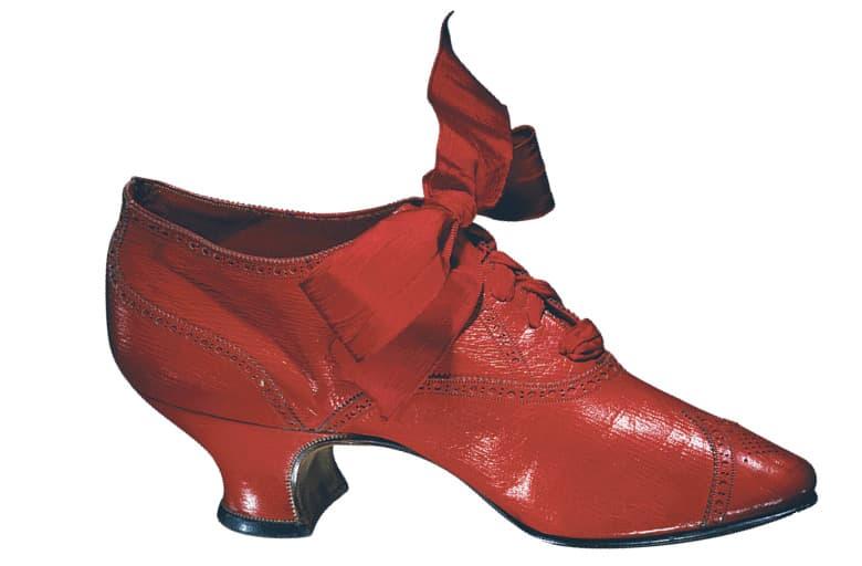 7 Женская кожаная туфля на деревянном каблуке «Людовик» со шнуровкой из шелковой ленты производства Hook, Knowles & Co., около 1900 года. Эти эффектные красные повседневные туфли, украшенные на мужской манер перфорацией, могли быть отличным дополнением к сшитым по индивидуальной мерке юбке, жакету или пальто для прогулок на открытом воздухе.
