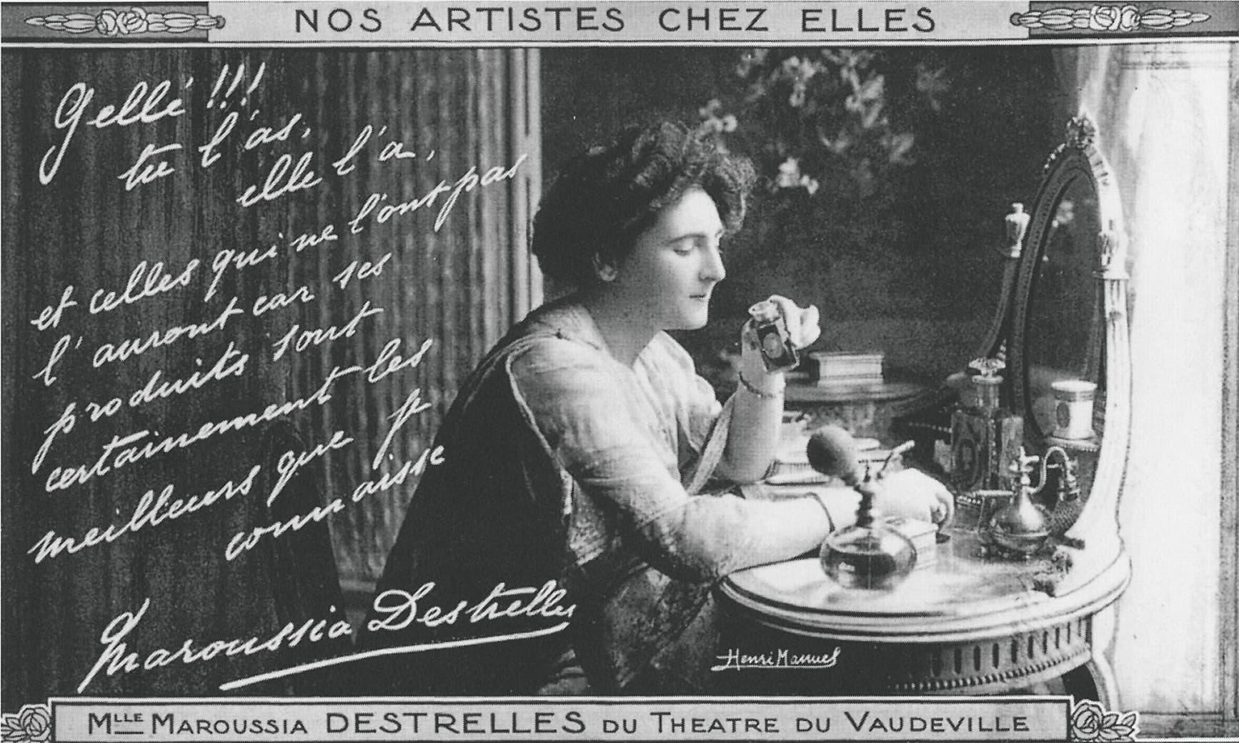 8 Косметические средства считались вульгарными, поэтому производители рекламировали их с особой осторожностью. Иногда приглашали актрис: мадемуазель Маруся Дестрель из парижского театра «Водевиль» предоставила свою рекомендацию производителю Gellé.