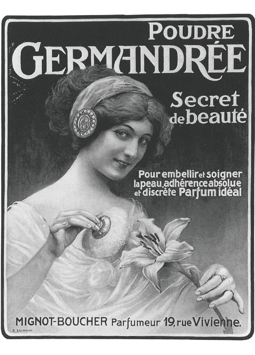 9 В рекламе журнала Les Modes, опубликованной в октябре 1911 года, утверждается, что пудра с ароматом цветка дубровника улучшает состояние кожи и питает ее. В ней также подчеркивается, что эффект получается незаметным.