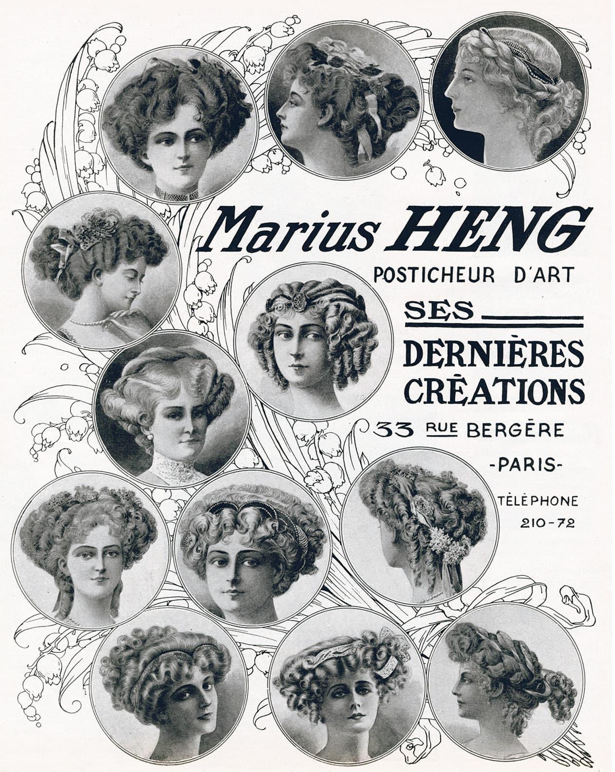 10 Реклама шиньонов Мариуса Хенга, 1909 год. Тем, кому недоставало густоты своих волос для создания модных в то время пышных причесок, помощь была наготове. Парикмахеры в том числе (Париж) предлагали шиньоны (постиши), которые придавали волосам объем и позволяли создать крупные волны, считавшиеся необходимыми. В ассортименте Хенга также были представлены специальные шиньоны белого или серого цвета для лысеющих или пожилых женщин.