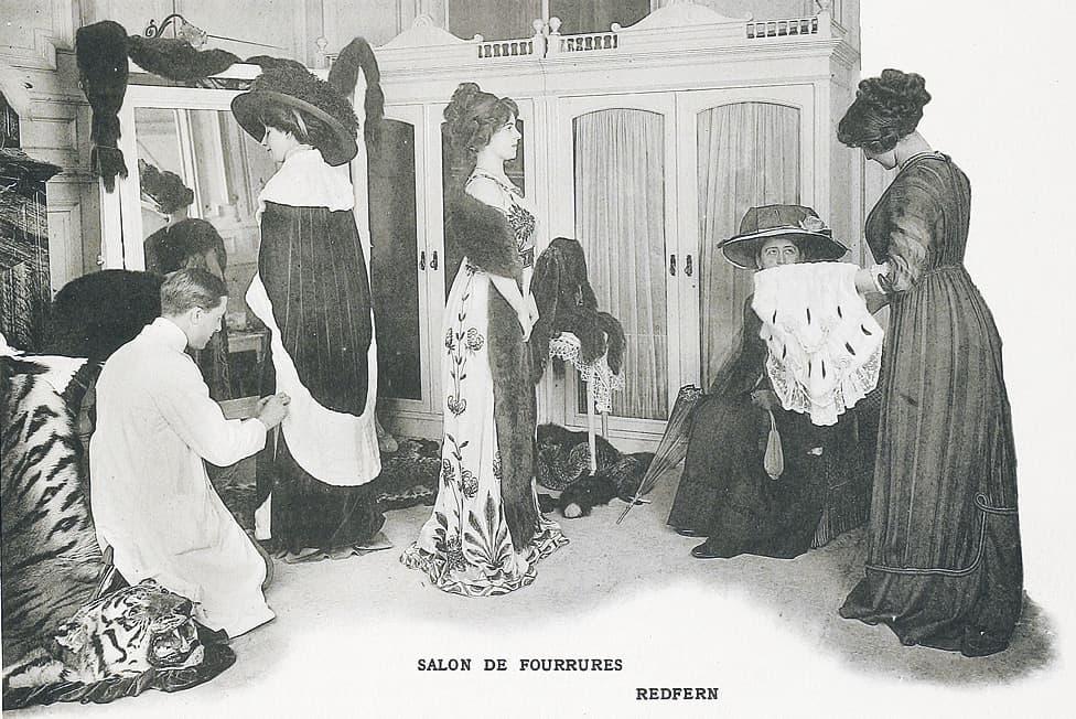 11 Меховой салон в ателье Редферна, Париж, 1910 год. Клиенты от-кутюр могли побаловать себя в элегантной обстановке. На этой постановочной фотографии запечатлен меховщик, работающий над горностаевым подбоем накидки, манекенщица, демонстрирующая меховой палантин, и покупательница, рассматривающая аксессуар из горностая с кружевной каймой.