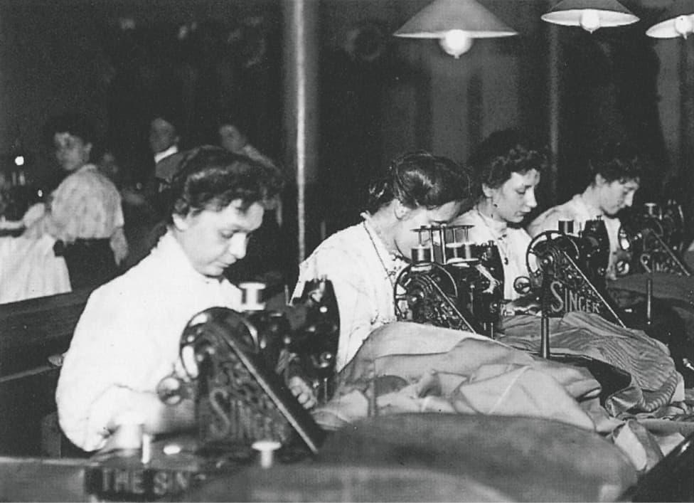 12 На фотографии 1909 года запечатлена менее привлекательная сторона мира моды — швеи, работающие по много часов, склонившись над машинами при скудном освещении.