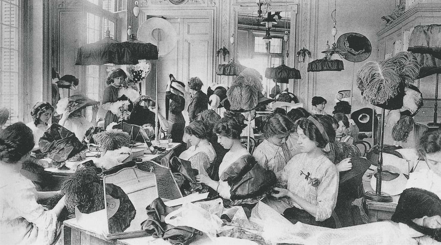 13 В переполненных мастерских модистки создавали роскошные шляпы, многие из которых были отделаны страусиными перьями. Париж, 1910 год.