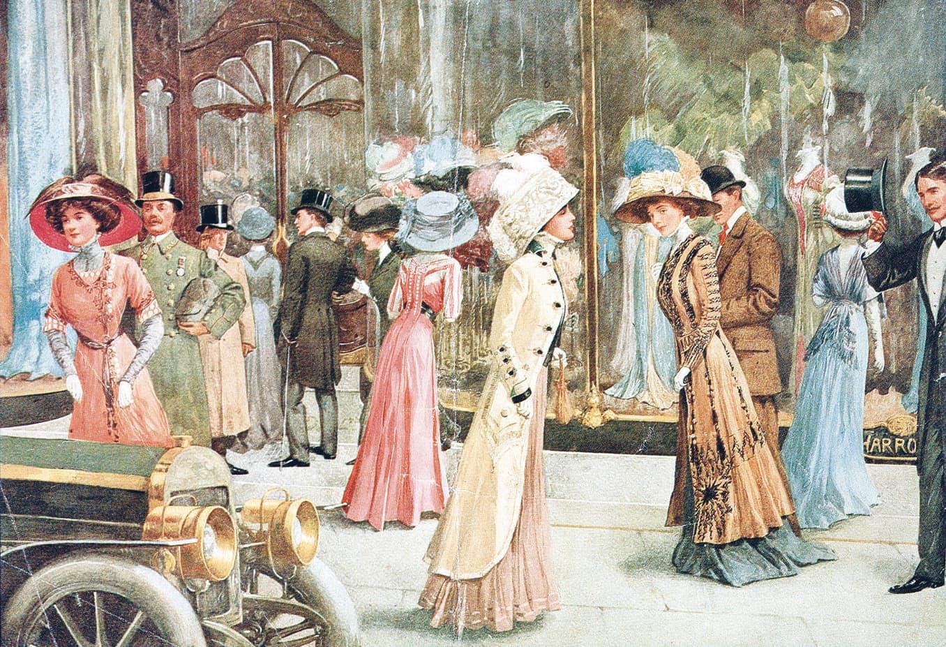 15 Универмаг Harrods, Лондон. К 1909 году, когда была сделана эта иллюстрация, преувеличенные изгибы начала 1900-х годов были вытеснены более стройными и спрямленными силуэтами, увенчанными огромными шляпами с декоративной отделкой. Городские щеголи носили цилиндры с визитками и сюртуками, а котелки — с менее официальными пиджачными парами, которые становились всё более популярными.