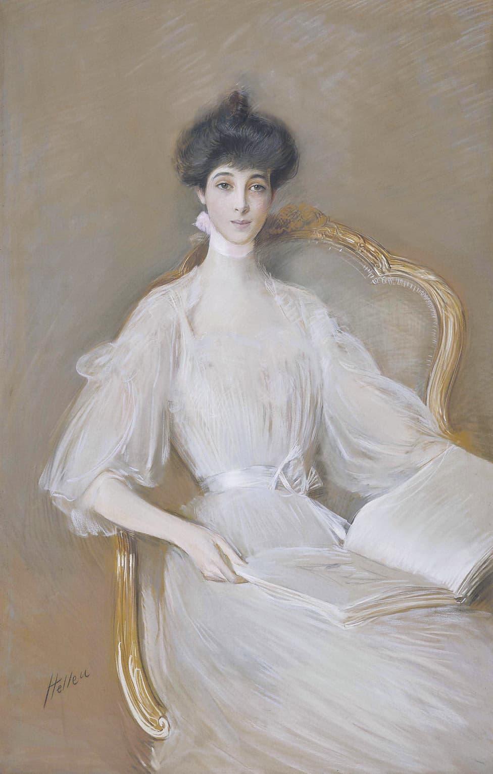 16 Портрет Консуэло, герцогини Мальборо, кисти Поля Эллё, около 1900. Одна из самых богатых и знаменитых наследниц Нового Света, Консуэло Вандербильт в 1895 году вышла замуж за представителя английской аристократии. Очарованный утонченной красотой герцогини художник Поль Эллё в начале 1900-х годов создал множество ее изображений, в том числе этот портрет в кресле, на котором она одета в воздушное белое шифоновое платье из шелка с высоким воротником-стойкой и длинными рукавами. Популярная поза для портретирования с книгой в руках указывала на образованность и пытливый ум модели.