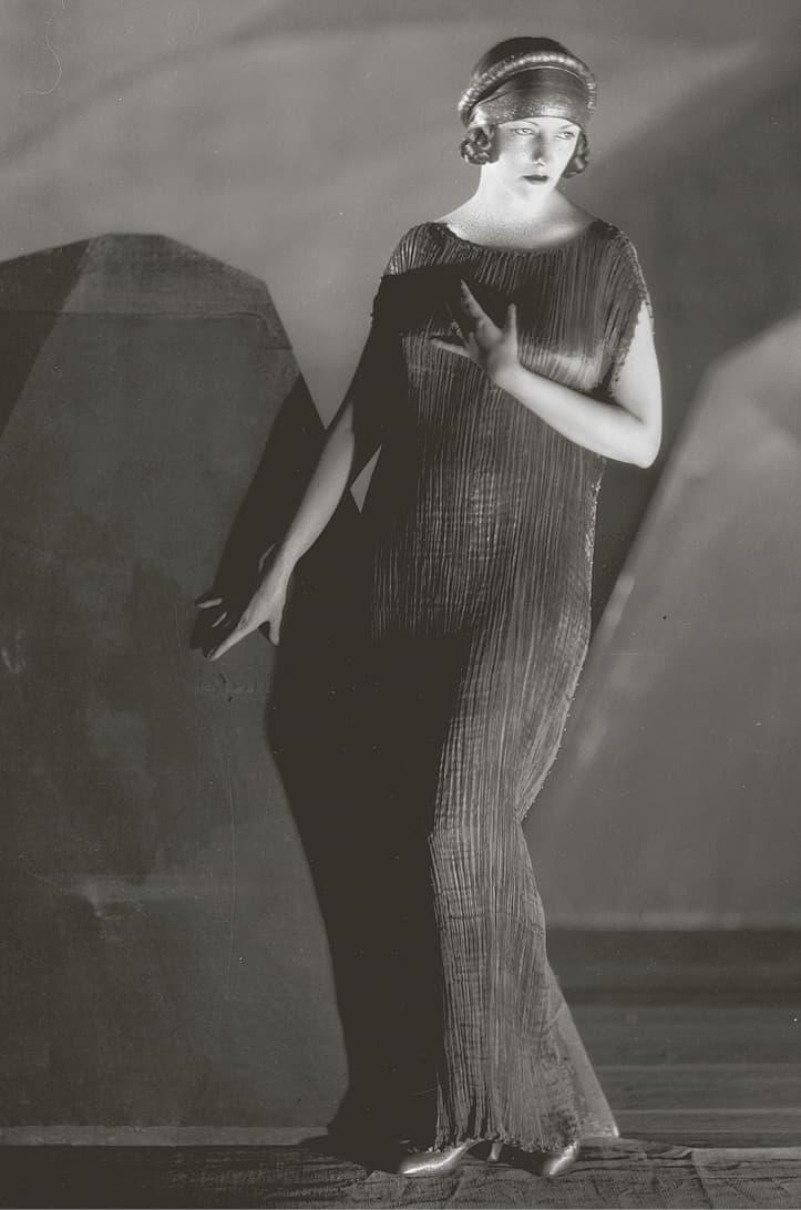 18 Актриса и дизайнер Наташа Рамбова (ставшая женой кинозвезды Рудольфа Валентино) одета в экзотический тюрбан и отделанное бисером плиссированное шелковое «дельфийское платье» от Мариано Фортуни. Классический фасон, запатентованный в 1909 году, с годами практически не изменился. Это платье, сфотографированное примерно в 1924 году, очень похоже на ранние версии модели.