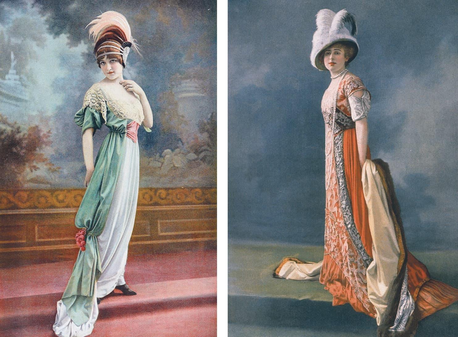19, 20 Два роскошных ансамбля от ведущих домов моды. Вечерний наряд с кружевной отделкой от дома Пакен 1912 года (слева), состоящий из распашного платья с высокой талией и короткими рукавами, корсетного лифа, надетого поверх прямой юбки, и головного убора с перьями, который визуально увеличивает рост. Модель 1909 года от дома Дусе (справа) также надевалась с высокой шляпой, украшенной плюмажем.