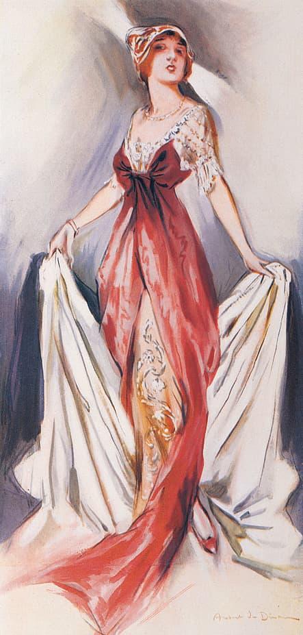21 Уорт славился своими экстравагантными, эффектными нарядами. Вечерний туалет 1912 года состоит из платья, расшитого бисером, и распашной накидки клубничного цвета фасона панье.