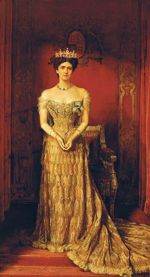 22 Мэри Виктория Лейтер, леди Керзон в платье «Павлин» работы Уильяма Логсдейла , 1909. Платье «Павлин» было придумано Жан-Филиппом Уортом, сыном основателя дома, для леди Керзон, супруги вице-короля Индии (в девичестве богатая наследница Мэри Лейтер из Чикаго), по случаю Делийского дарбара в 1903 году. Шелковый атлас цвета слоновой кости был специально расшит в Индии шелком, металлическими нитями и переливающимися крыльями жука златки, чтобы составить узор в виде переплетенных павлиньих перьев.