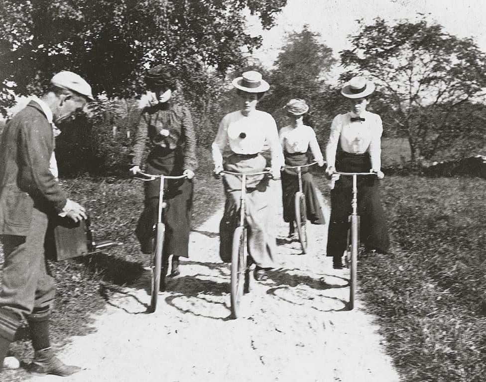 23 Езда на велосипеде становилась всё более популярным занятием как мужчин, так и женщин, но плотно сидящая одежда стесняла движения и могла провоцировать несчастные случаи. В 1902 году эти американские велосипедистки под сшитыми на заказ юбками и блузками носили тугие корсеты. Соломенная шляпка-канотье часто служила шикарным завершающим штрихом и вносила в ансамбль спортивную нотку.