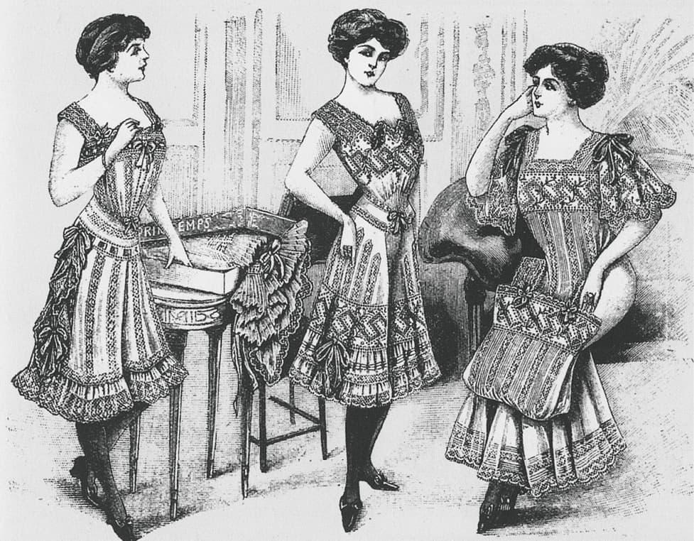 Модно одетая женщина начала 1900-х годов под верхней одеждой, завершавшей ее туалет, была облачена в несколько слоев нижнего белья. Одевание и раздевание были трудоемкими, отнимающими много времени процессами, требующими участия служанки. Первый слой — это сорочка и панталоны или комбинации из тонкого белого хлопка, искусно расшитые белой гладью, отделанные кружевом и перевязанные узкими ленточками. Затем следовал корсет — важнейший элемент, формирующий фигуру и осанку его обладательницы, а также силуэт верхней одежды. Женщины жаловались на неудобство корсетов, а сторонники реформы одежды, в том числе практикующие врачи, сетовали на физический вред, который этот предмет одежды наносит костям и внутренним органам. Такие публикации, как квартальный Обзор костюма от Союза здорового образа жизни и художественной одежды, призывали своих читательниц полностью отказаться от корсетов и использовать менее стесняющие грудь грации, но желающие обрести идеальные формы, предписанные модой, добровольно переносили страдания.