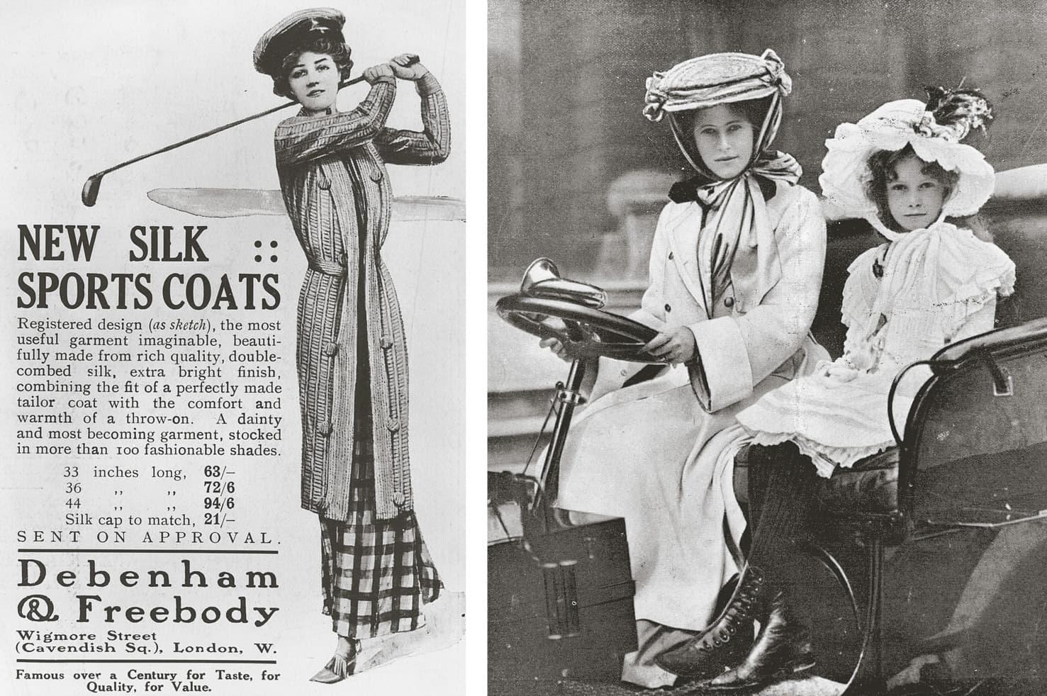26, 27 Занятия спортом требовали специальной одежды. Готовая спортивная одежда для игры в гольф (слева), подобная этому длинному шелковому жакету (около 1910), сочетала в себе комфорт и стиль. Просторный фасон позволяет сделать замах клюшкой, а шелк удерживает тепло на продуваемых ветром полях для гольфа. Голову защищает большая кепка на мужской манер, повторяющая форму тэм-о-шентера — шотландского берета. Новое увлечение автомобильной ездой потребовало создания защитной одежды, подходящей для поездок в открытых автомобилях, хотя в апреле 1905 года герцогиня Сазерленд (президент Лондонского женского автомобильного клуба) отказалась от обычных перчаток с крагами, вуали и защитных очков (справа). Вместо этого она прикрыла волосы широкой шляпой с плоской тульей (ленты туго завязаны под подбородком) и надела просторный пыльник поверх дневного наряда.