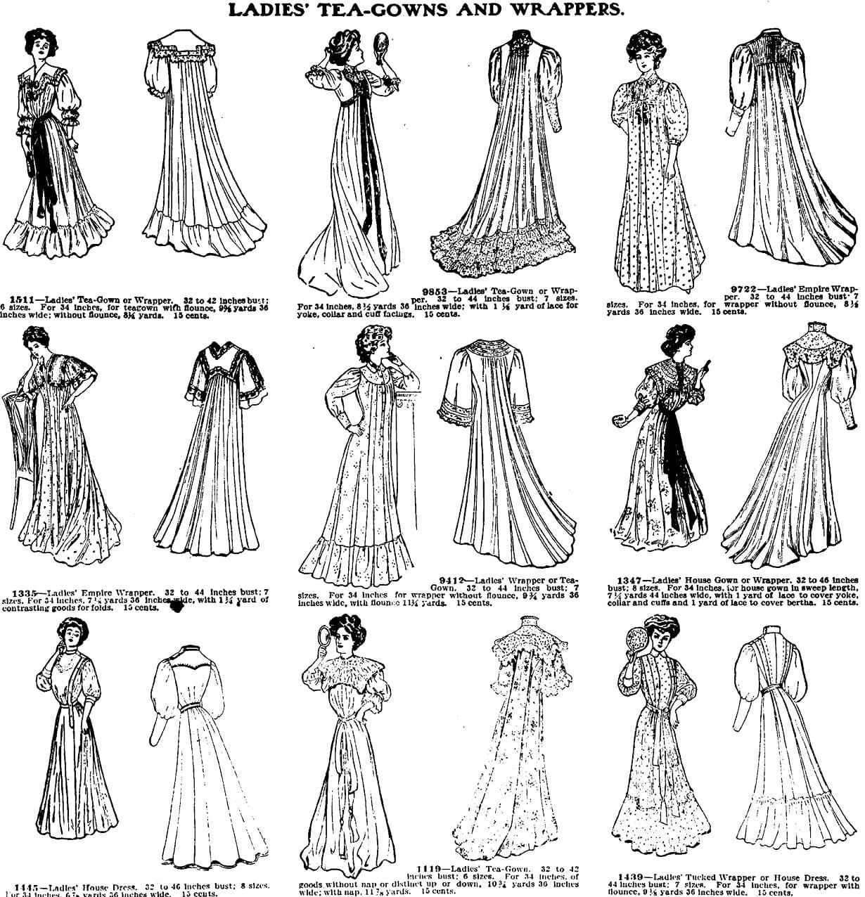 28 Бумажные выкройки позволили портнихам-любительницам на дому создавать недорогую одежду, включая чайные платья, накидки и платья для дома. Компания Butterick (с филиалами в Лондоне, Париже и Нью-Йорке) в своем каталоге модной одежды зимы 1907–1908 года предлагала разнообразные модели на любой вкус.