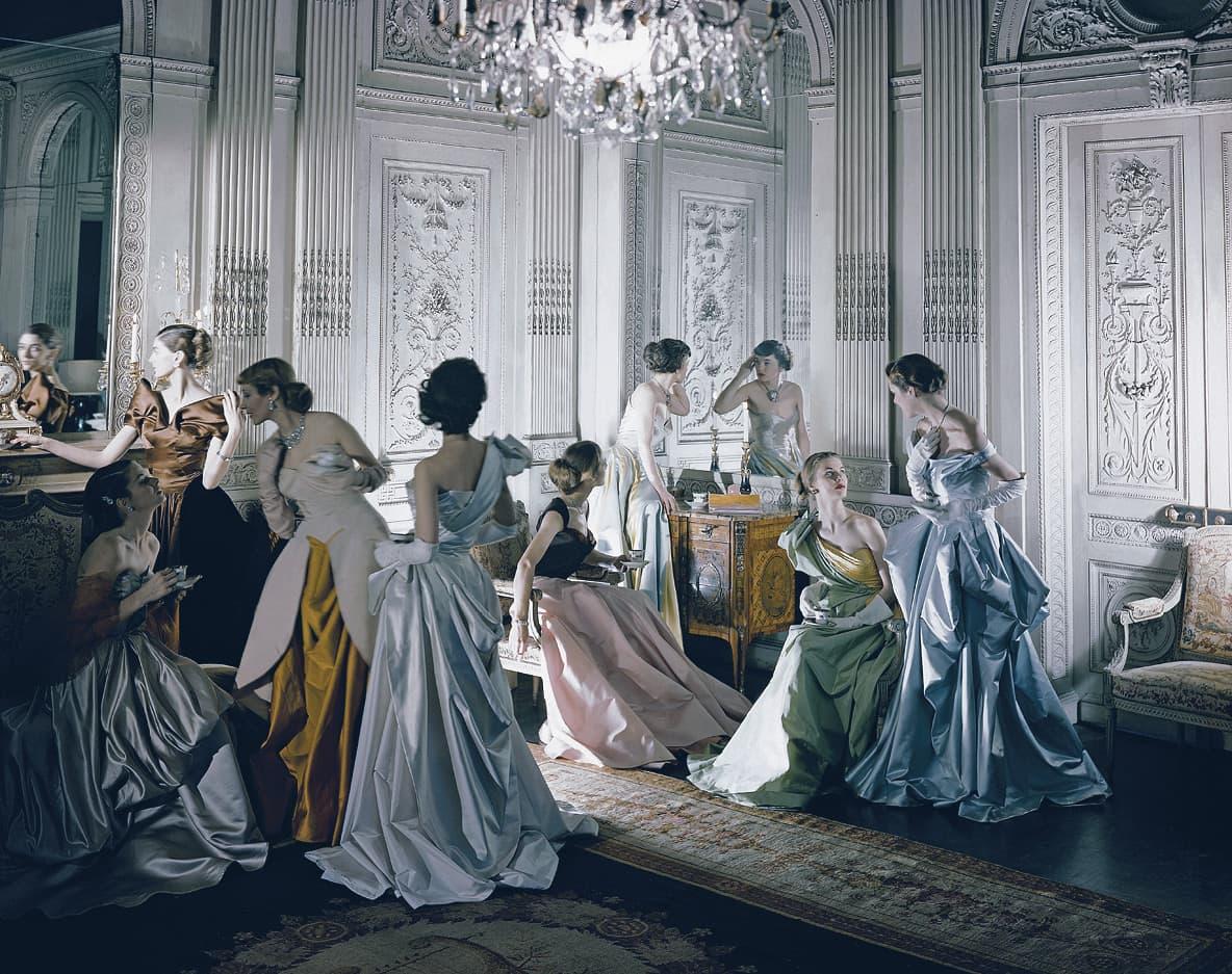 1 Манекенщицы в вечерних туалетах от англо-американского кутюрье Чарльза Джеймса. Джеймс был модельером исключительного мастерства и обладал богатым воображением: эти элегантные вечерние платья из шелкового атласа, созданные в 1946–1948 годах, являются примером того, как он применял эффектные и скульптурные драпировки и изысканные сочетания цветов. Фотография Сесила Битона, опубликованная в журнале Vogue в 1948 году.