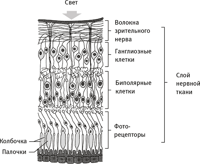 Рис. 1.1. Сетчатка глаза, которая обеспечивает связь между светом и мозговой активностью