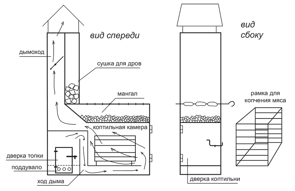 Домашняя коптильня. Это фактически вариант печки. Главное в ней – герметичная дымообразовательная камера, которую можно выложить из кирпича или сварить из листов металла. Для большей плотности ее лучше обмазать специальным глиняным раствором. Дерево (топливо) укладывается в камеру дымообразователя, заполняя ее целиком. Потом камеру печи закрывают, и процесс тления поленьев или стружки идет 4–5 часов. После этого желаемое блюдо готово.