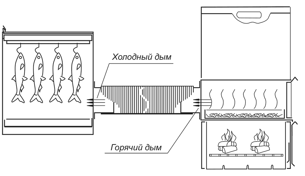 Коптильня холодного копчения передает дым к отделению с едой. Охлаждение дыма происходит в туннеле, соединяющем коптильню и топку с древесиной. Их расстояние не должно быть меньше 2 м между собой, но и не больше 7 м, иначе могут появиться проблемы с тягой.