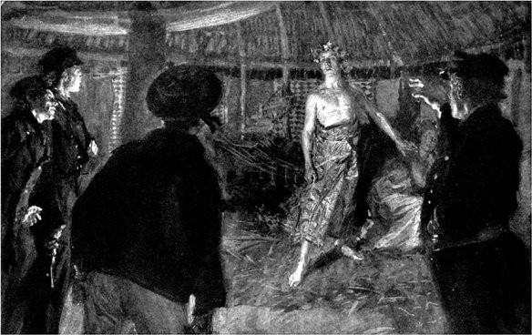 For the better part of a fortnight Jack lay where they had placed him on the mats, undergoing, with intermissions of fever and delirium, the tedious stages of convalescence. Fetuao seemed never to leave him, attending to his wants, brushing away the flies, feeding and washing him with an anxious solemnity that at times almost awed the sailor. Her brilliant eyes, as black and limpid as some wild animal's, watched him with an unceasing stare. He often wondered what was passing in her graceful head as he lay looking up at her, too weak to speak, the drowsy hours succeeding one another in an unbroken silence. Once, when he ran his hand over his face and recollected with a pang how old and ugly he must seem to her, she had understood the sigh that expressed his own self-disgust, and had bent over and kissed him on the lips. From that moment his love for her deepened into an emotion transcending anything he had ever felt before. He saw now that to separate himself from her would be to break both their hearts; that, for good or evil, he was hers and she his; that fate had indeed joined them forever.