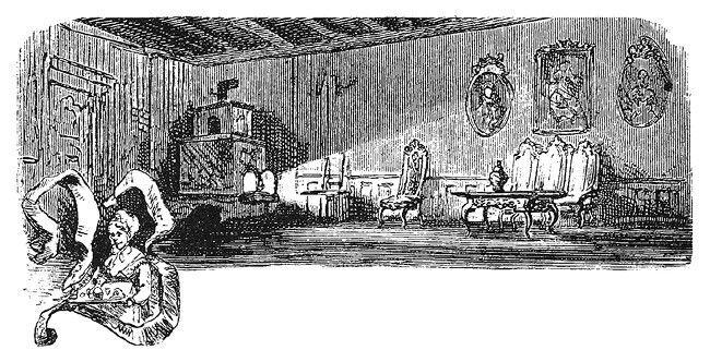 Я последовал радушному приглашению. Когда я вошел в комнату, она была освещена только неровным дрожащим отблеском огня, пылавшего в большой четырехугольной чугунной печке с настежь открытой дверцей. Комната была очень глубока и обставлена старинной мебелью: кожаными стульями с высокими спинками и диванами, рассчитанными на кринолины. Стены были украшены масляными картинами и портретами вытянутых в струнку дам в пудреных париках, королей Ольденбургского дома и других именитых персон в латах или красных кафтанах.