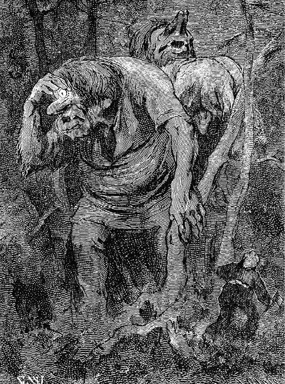 В ту же минуту увидали мальчуганы троллей, таких толстых и огромных, что они головами хватали до верхушек сосен. Но у всех троих был только один глаз; они им пользовались по очереди. Во лбу у каждого была дырка, в нее-то они и вставляли глаз и придерживали его рукой. Тот, у кого был глаз, служил вожаком для остальных, которые держались за него.