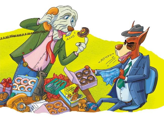Это был худший день в жизни полицейского дога Шмитта. За одно только утро он съел больше пончиков с сахарной глазурью, чем за всю жизнь. Друзья по работе завалили стол подарками и коробками с ароматной мягкой выпечкой. Шмитт честно пытался поделиться с сослуживцами, но те только фырчали в ответ, махали на прощание хвостами разной длины и убегали ловить преступников.