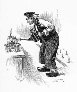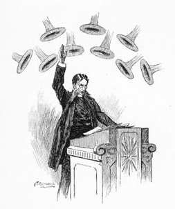 "Thank you," said the Idiot. "But I don't need money. I don't like money. Money is responsible for more extravagance than any other commodity in existence. Besides, it and I are not intimate enough to get along very well together, and when I have any I immediately do my level best to rid myself of it. But to return to our canal-boat, I note a look of disapproval in Mr. Whitechoker's eyes. He doesn't seem to think any more of my scheme than do the rest of you—which I regret, since I believe that he would be the gainer if land edifices were supplanted by the canal system as proposed by myself. Take church on a rainy morning, for instance. A great many people stay at home from church on rainy mornings just because they do not want to venture out in the wet. Suppose we all lived in canal-boats? Would not people be deprived of this flimsy pretext for staying at home if their homes could be towed up to the church door? Or, better yet, granting that the churches followed out the same plan, and were themselves constructed like canal-boats, how easy it would be for the sexton to drive the church around the town and collect the absentees. In the same manner it would be glorious for men like ourselves, who have to go to their daily toil. For a consideration, Mrs. Pedagog could have us driven to our various places of business every morning, returning for us in the evening. Think how fine it would be for me, for instance, instead of having to come home every night in an overcrowded elevated train or on a cable-car, to have the office-boy come and announce, 'Mrs. Pedagog's Select Home for Gentlemen is at the door, Mr. Idiot.' I could step right out of my office into my charming little bedroom up in the bow, and the time usually expended on the cars could be devoted to dressing for tea. Then we could stop in at the court-house for our legal friend; and as for Doctor Capsule, wouldn't he revel in driving this boarding-house about town on his daily rounds among his patients?"