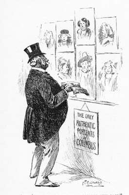 "That only proves what I have always said," replied the Idiot. "Wise men can't find fun in anything but stern facts. Wise men always do laugh at truth. Whenever I advance some new proposition, you sit up there next to Mrs. Pedagog and indulge in tutt-tutterances of the most intolerant sort. If you had been one of the wise men of Columbus's time there isn't any doubt in my mind that when Columbus said the earth was round, you'd have remarked tutt, tutt, in Spanish." There was silence for a minute, and then the Idiot began again. "There's another point about this whole business that makes me tired," he said. "It only goes to prove the conceit of these Europeans. Here was a great continent inhabited by countless people. A European comes over here and is said to be the discoverer of America and is glorified. Statues of him are scattered broad-cast all over the world. Pictures of him are printed in the newspapers and magazines. A dozen different varieties of portraits of him are printed on postage-stamps as big as circus posters—and all for what? Because he discovered a land that millions of Indians had known about for centuries. On the other hand, when Columbus goes back to Spain several of the native Americans trust their precious lives to his old tubs. One of these savages must have been the first American to discover Europe. Where are the statues of the Indian who discovered Europe? Where are the postage-stamps showing how he looked on the day when Europe first struck his vision? Where is anybody spending a billion of dollars getting up a world's fair in commemoration of Lo's discovery of Europe?"