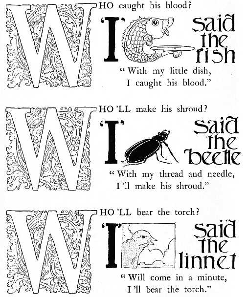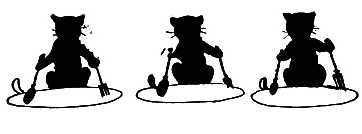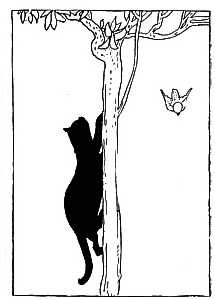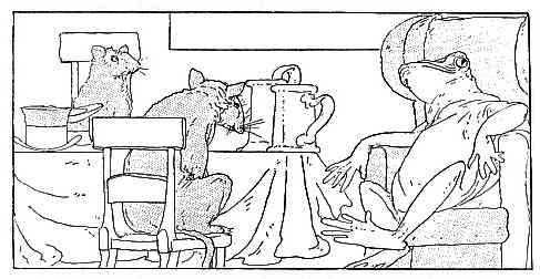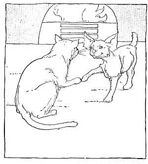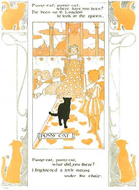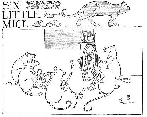 Six little mice sat down to spin, Pussy passed by, and she peeped in. "What are you at, my little men?" "Making coats for gentlemen." "Shall I come in and bite off your threads?" "No, no, Miss Pussy, you'll bite off our heads." "Oh, no, I'll not, I'll help you spin." "That may be so, but you don't come in."