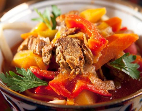 Когда все ингредиенты будут готовы, выкладываем поверх мяса с овощами картофель и кусочек сливочного масла. Также добавляем специи, солим и перчим по вкусу. Затем вливаем 200 миллилитров кипячёной воды комнатной температуры. Накрываем казан крышкой и тушим на среднем огне около 40 минут.