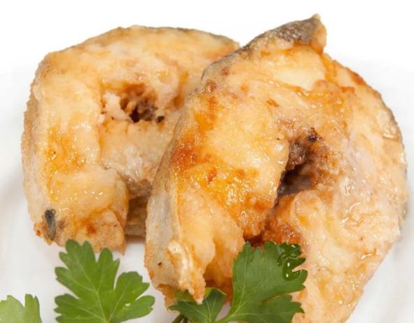 Кусочки рыбы слегка присаливаем и перчим. Затем обваливаем в муке и обжариваем на растительном масле до появления лёгкой золотистой корочки. После этого перекладываем рыбу в форму для запекания.