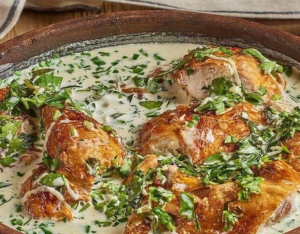 Прежде всего, необходимо замариновать голени. Для этого в сметану следует добавить чеснок, хмели-сунели, соль и чёрный молотый перец. Тщательно перемешайте маринад и залейте им ножки. Оставьте на 30 минут.