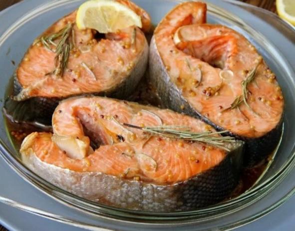 В томатный сок добавляем соль, сахар и чёрный молотый перец. Тщательно перемешиваем и заливаем этой смесью рыбу.