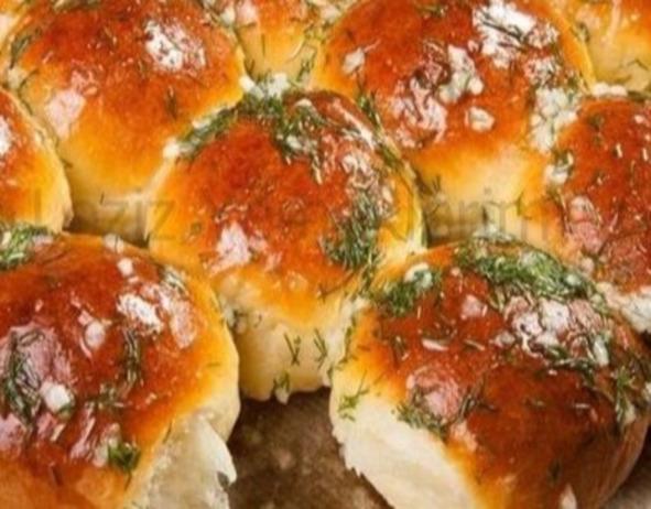 Готовые пампушки достаём из духовки и сразу же смазываем ароматной заливкой.