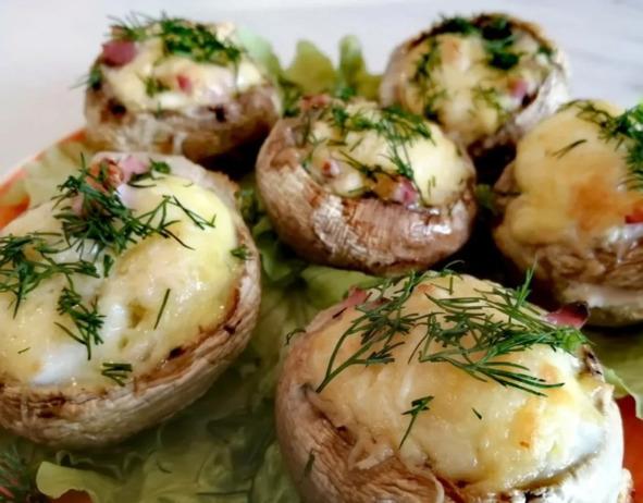 Получившейся массой начиняем шляпки. Затем запекаем при температуре 200 градусов в течение 10 минут, периодически поливая белым вином для придания аромата.