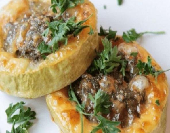На 1 кабачок, нарезанный кружочками — 200 гр. Фарша;