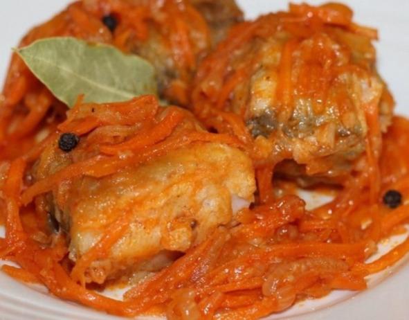 Лук и морковь пассеруем на растительном масле и равномерно распределяем поверх рыбы.