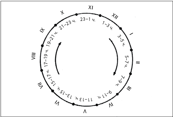 Рис. 2. Схема почасовой активности меридианов: I. Легкие. II. Толстая кишка. III. Желудок. IV. Поджелудочная железа. V. Сердце. VI. Тонкая кишка. VII. Мочевой пузырь. VIII Почка. IX. Перикард. X. Меридиан трех частей туловищ. XI. Желчный пузырь. XII. Печень