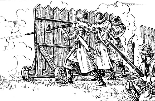 Катапульты и требушеты, тараны и онагры, штурмовые башни и лестницы — история знала множество осадных приспособлений самого разного назначения и принципа действия. Существовало и орудие, присущее в первую очередь русской военной культуре, — гуляй-город, или, как говорили иногда, град-обоз. Второе название вызывает стойкие ассоциации с повозками, которые ставили кольцом американские переселенцы, чтобы отбиваться от индейцев. Это справедливо, поскольку принцип здесь тот же самый.